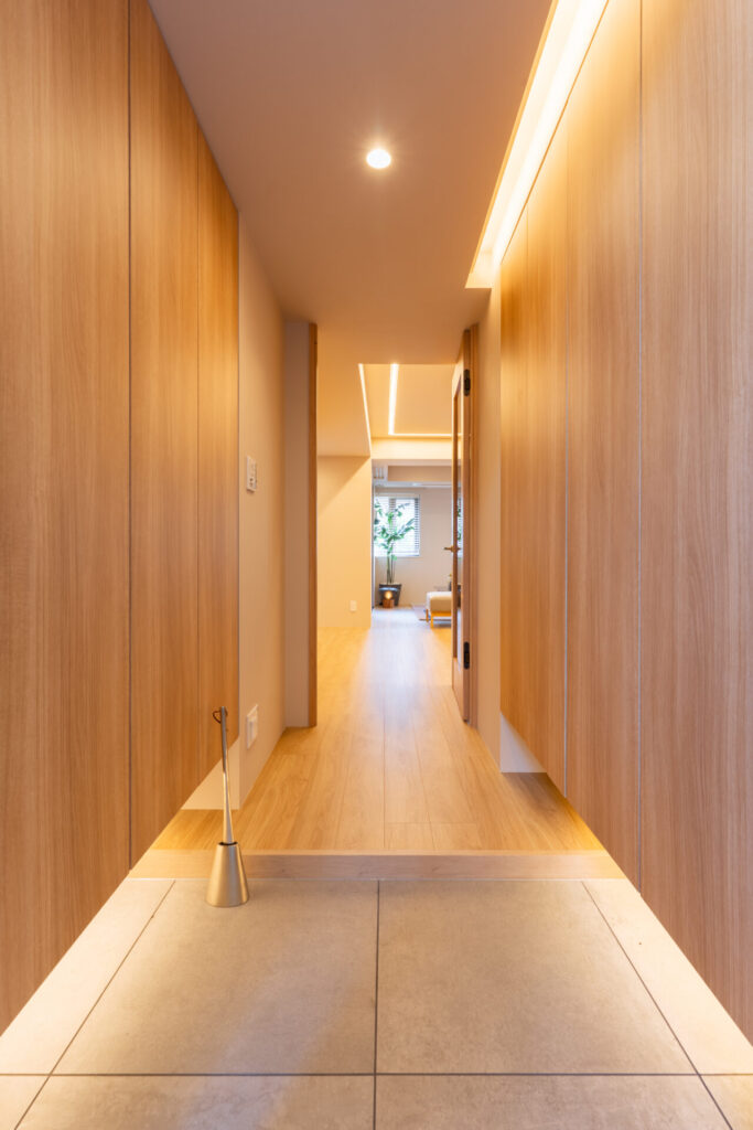 玄関の両サイドには、間接照明を備えた大容量収納。シューズはもちろん、アウターや日用品などの収納にも活用できそうです。