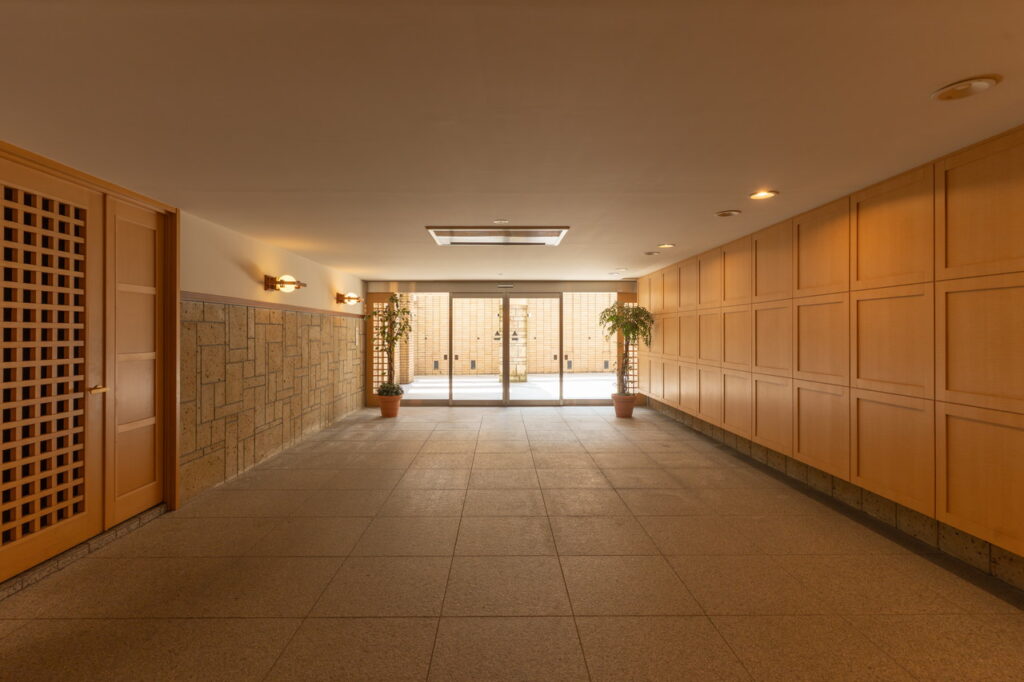 整えられた植栽が出迎えてくれるエントランス。優しい色合いのタイル張りの外観が、成熟した街並みに溶け込みます。