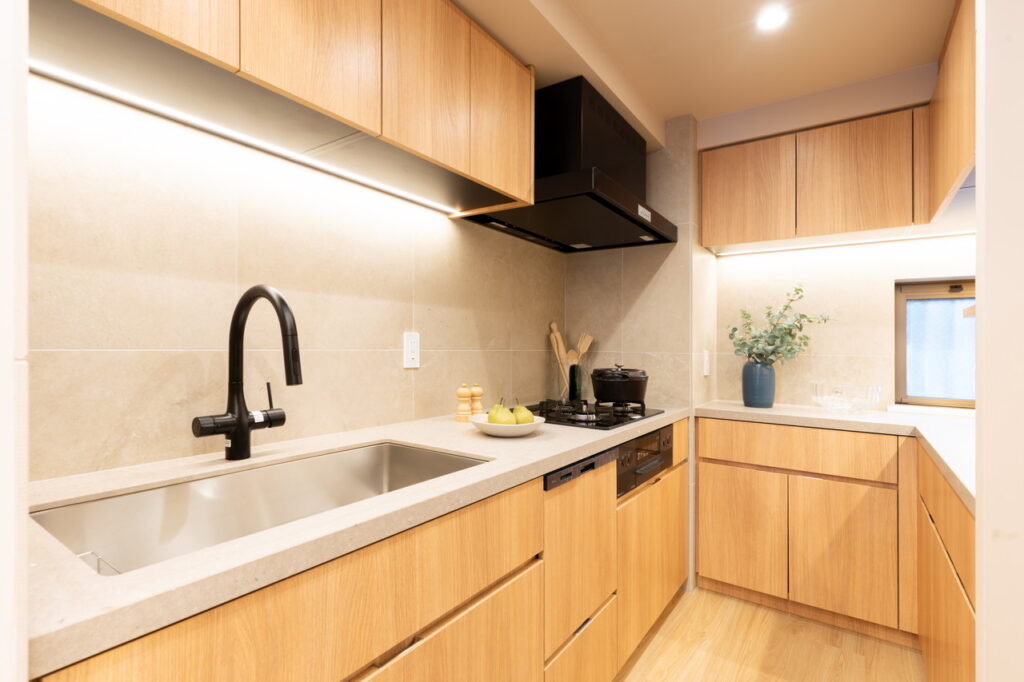 玄関ホールを進みお部屋に入ると右手にあるキッチン。壁のタイルもナチュラルベースのやさしい色合いで居心地の良いキッチン空間です。